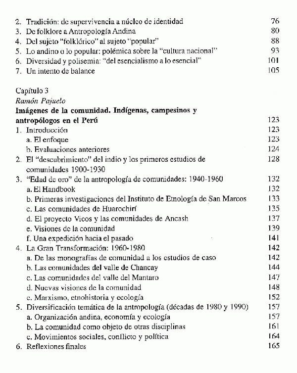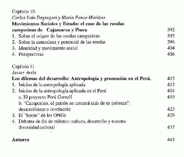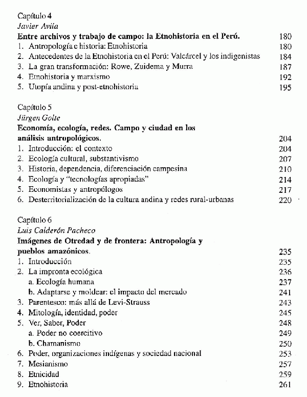 La primera parte dibuja un panorama general de las cuales ha trabajado la Antropología: las comunidades campesinas, el ámbito amazónico y urbano, los estudios sobre folklore, temas como redes y movimientos sociales, estudios de género, educación.