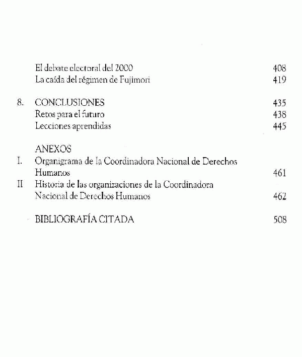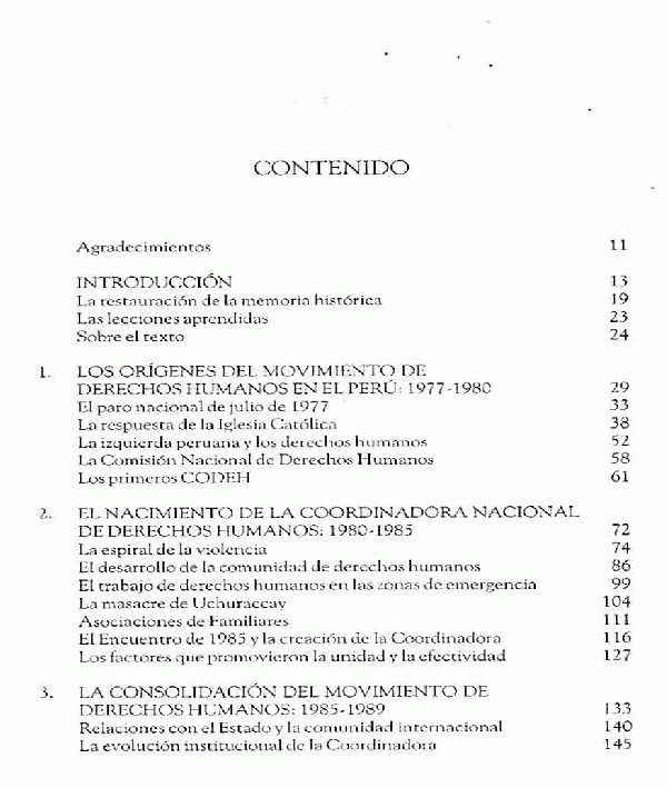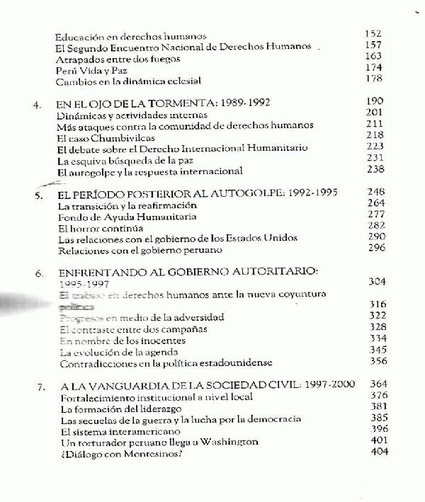 Este libro recoge la historia política del Perú desde finales de los años setenta, cuando la lucha contra la dictadura militar llevó al nacimiento de organizaciones que procuraban velar por la defensa de las víctimas de dicho movimiento, hasta el año 2000, cuando se derrumbó el régimen Fujimorista. El eje vertebral del libro es la Coordinadora Nacional de Derechos Humanos, una de las organizaciones civiles más exitosas en el Perú y América Latina, en la defensa de los valores que han marcado la civilización de nuestro tiempo.