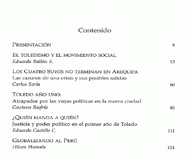 Perú Hoy: Toledo: A un Año de Gobierno / Eduardo Ballón, Carlos Soria, Gustavo Riofrío, Eduardo Castillo, Ulises Humala, Gabriela Carrasco, Julio Gamero, Raúl Ruiz [Impreso]