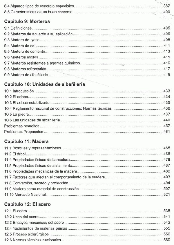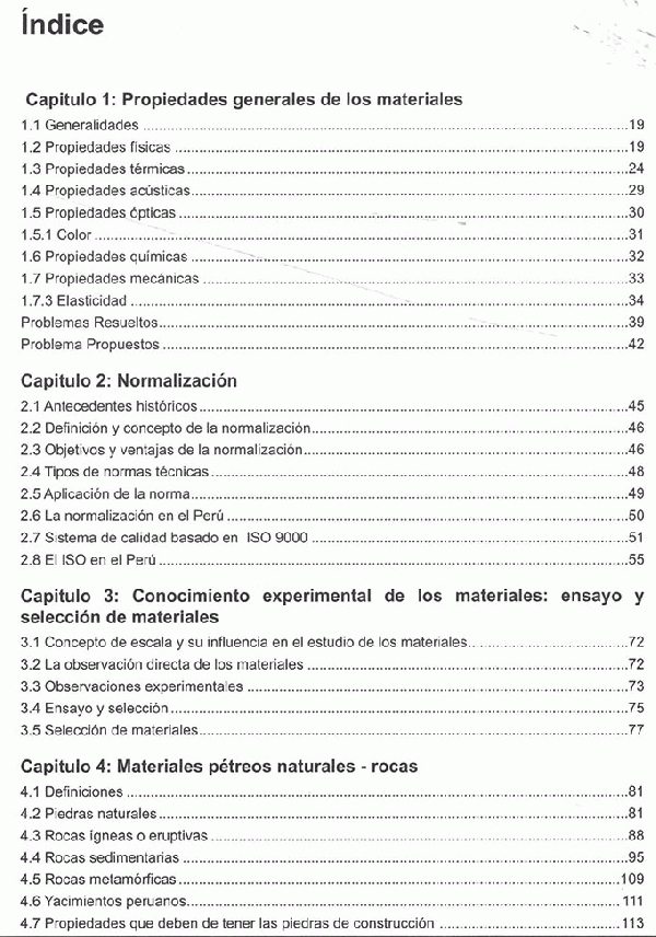 Capítulo 1: Propiedades generales de los materiales -- Capítulo 2: Normalización -- Capítulo 3: Conocimiento experimental de los materiales: ensayo y selección de materiales -- Capítulo 4: Materiales pétreos naturales - rocas -- Capítulo 5: Aglomerantes -- Capítulo 6: Agregados -- Capítulo 7: Agua para concretos y morteros -- Capítulo 8: Concretos -- Capítulo 9: Morteros -- Capítulo 10: Unidades de albañilería -- Capítulo 11: Madera -- Capítulo 12: Acero -- Capítulo 13: Geosintéticos -- Capítulo 14: Plásticos -- Capítulo 15: Pinturas