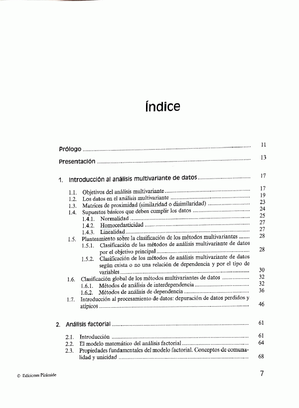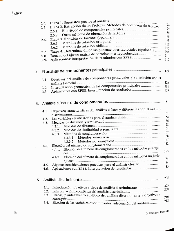 Introducción al análisis multivariante de datos -- Análisis factorial -- El análisis de componentes principales -- Análisis clúster o de conglomerados -- Análisis discriminante -- Análisis de regresión logística.