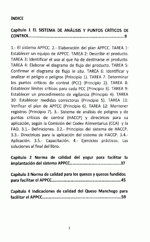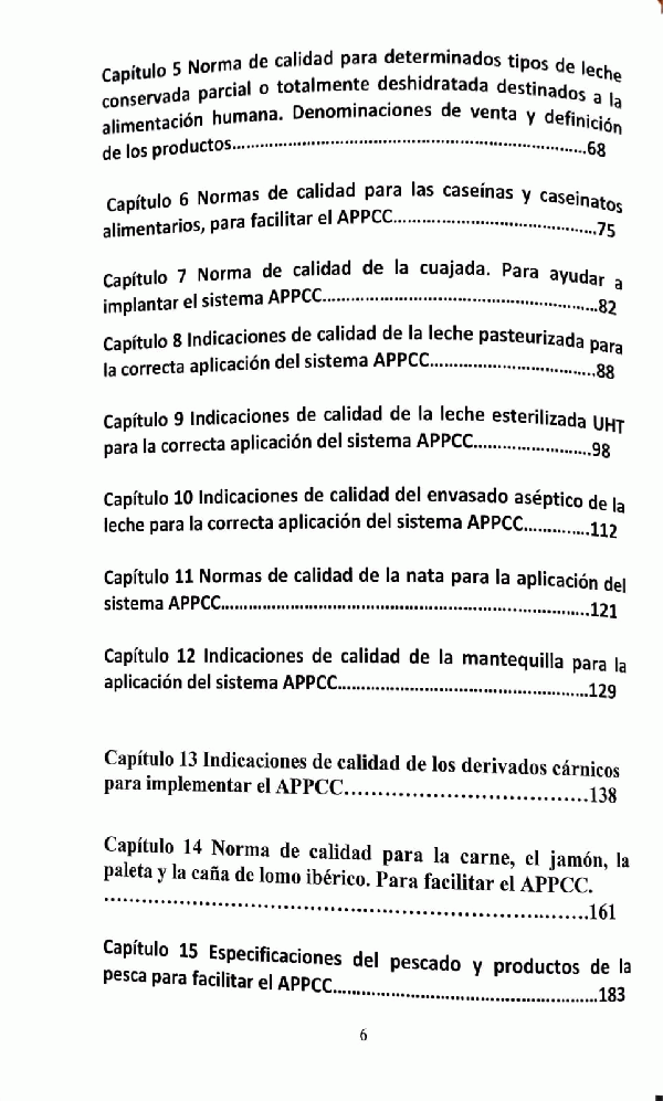 El Sistema de Análisis y Puntos Críticos de Control (APPCC) -- Norma de calidad del yogur para facilitar la implantación del sistema APPCC -- Norma de calidad para los quesos y quesos fundidos para facilitar el APPCC -- Indicaciones de calidad del Queso Manchego para facilitar el APPCC -- Norma de calidad para determinados tipos de leche conservada parcial o totalmente deshidratada destinados a la alimentación humana. Denominaciones de venta y definición de los productos -- Normas de calidad para las caseínas y caseinatos alimentarios, para facilitar el APPCC -- Norma de calidad de la cuajada. Para ayudar a implantar el sistema APPCC -- Indicaciones de calidad de la leche pasteurizada para la correcta aplicación del sistema APPCC -- Indicaciones de calidad de la leche esterilizada UHT para la correcta aplicación del sistema APPCC -- Indicaciones de calidad del envasado aséptico de la leche para la correcta aplicación del sistema APPCC -- Normas de calidad de la nata para la aplicación del sistema APPCC -- Indicaciones de calidad de la mantequilla para la aplicación del sistema APPCC -- Indicaciones de calidad de los derivados cárnicos para implementar el APPCC -- Norma de calidad para la carne, el jamón, la paleta y la caña de lomo ibérico. Para facilitar el APPCC -- Especificaciones del pescado y productos de la pesca para facilitar el APPCC -- Seguridad alimentaria y nutricional Trazabilidad.