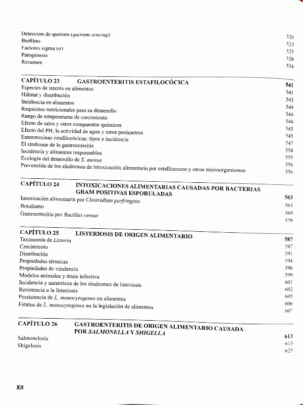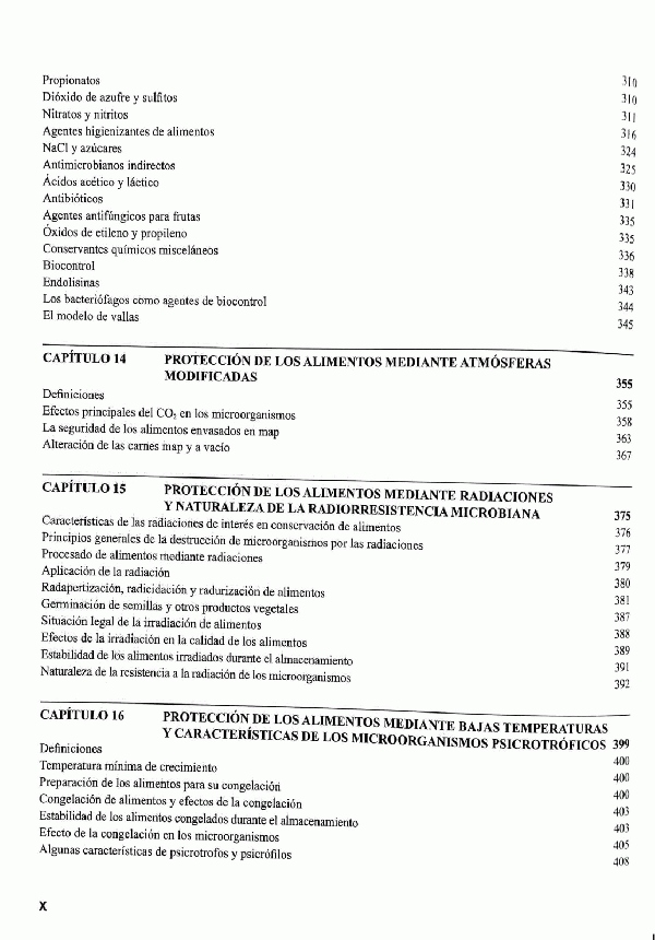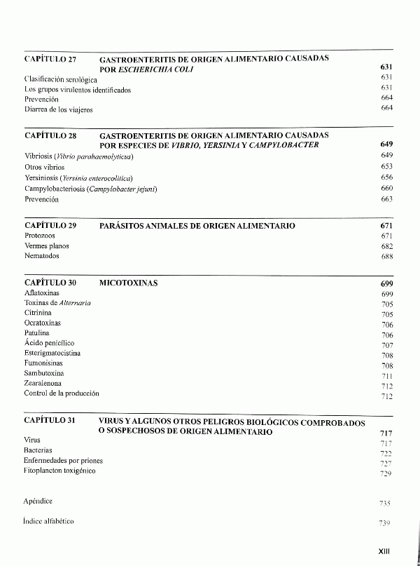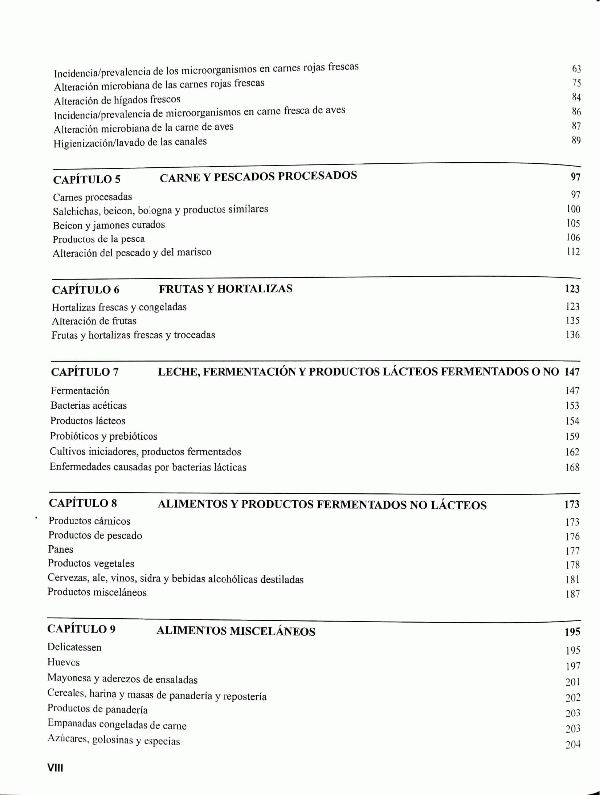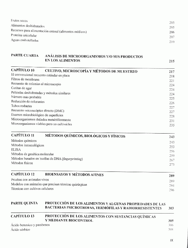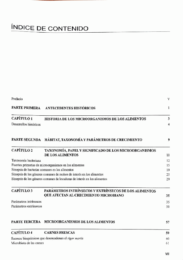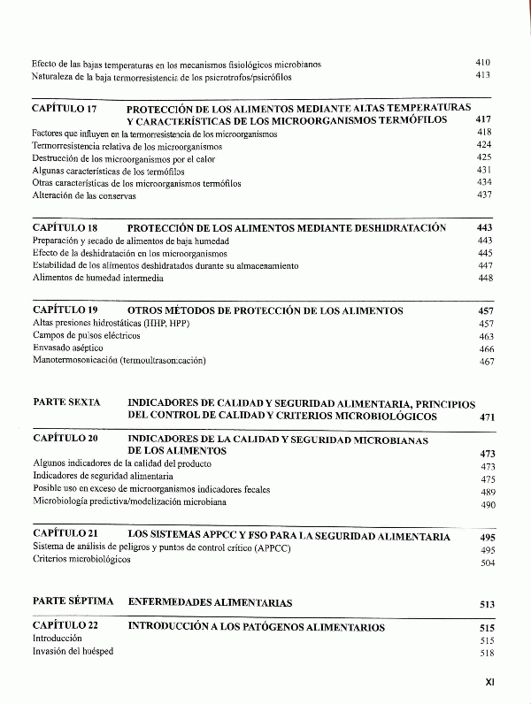 Historia de los microorganismos de los alimentos -- Taxonomía, papel y significado de los microorganismos de los alimentos -- Parámetros intrínsecos y extrínsecos de los alimentos que afectan al crecimiento microbiano -- Carnes frescas -- Carne y pescado procesados -- Frutas y hortalizas -- Leche, fermentación y productos lácteos fermentados o no -- Alimentos misceláneos -- Cultivo, microscopía y métodos de muestreo -- Métodos químicos, biológicos y físicos -- Bioensayos y métodos afines -- Protección de los alimentos con sustancias químicas y mediante biocontrol -- Protección de los mediante atmósferas modificadas -- Protección de los alimentos mediante radiaciones y naturaleza de la radiorresistencia microbiana -- Protección de los alimentos mediante bajas temperaturas y características de los microorganismos psicdrotróficos -- Protección de los alimentos mediante altas temperaturas y características de los microorganismos termófilos -- Protección de los alimentos mediante deshidratación -- Otros métodos de protección de los alimentos -- Indicadores de calidad y seguridad alimentaría, principios del control de calidad y criterios microbiológicos -- Indicadores de la calidad y seguridad microbianas de los alimentos -- Los sistemas APPCC y FSO para la seguridad alimentaria -- Introducción a los patógenos alimentarios -- Gastroenteritis estafilocócica -- Intoxicaciones alimentarias causadas por bacterias gram positivas esporuladas -- Listeriosis de origen alimentario -- Gastroenteritis de origen alimentario causada por salmonella y shigella -- Gastroenteritis de origen alimentario causadas por escherichia coli -- Gastroenteritis de origen alimentario causadas por especies de vibrio, yersina y campylobacter -- Parásitos animales de origen alimentario -- Micotoxinas -- Virus y algunos otros peligros biológicos comprobados o sospechosos de origen alimentario.