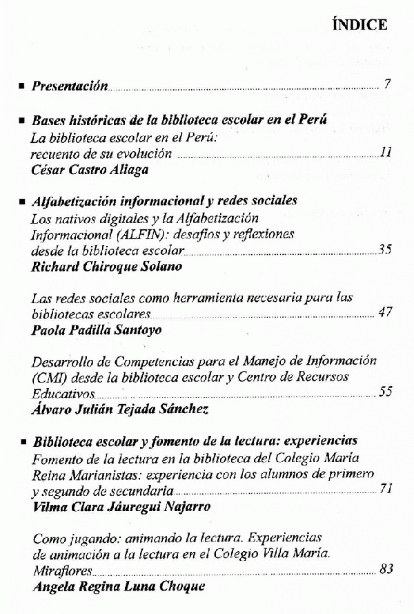 los autores están convencidos de que la única manera de contribuir a la renovación de la biblioteca escolar en el Perú es difundiendo y compartiendo experiencias, reflexiones y preocupaciones profesionales.